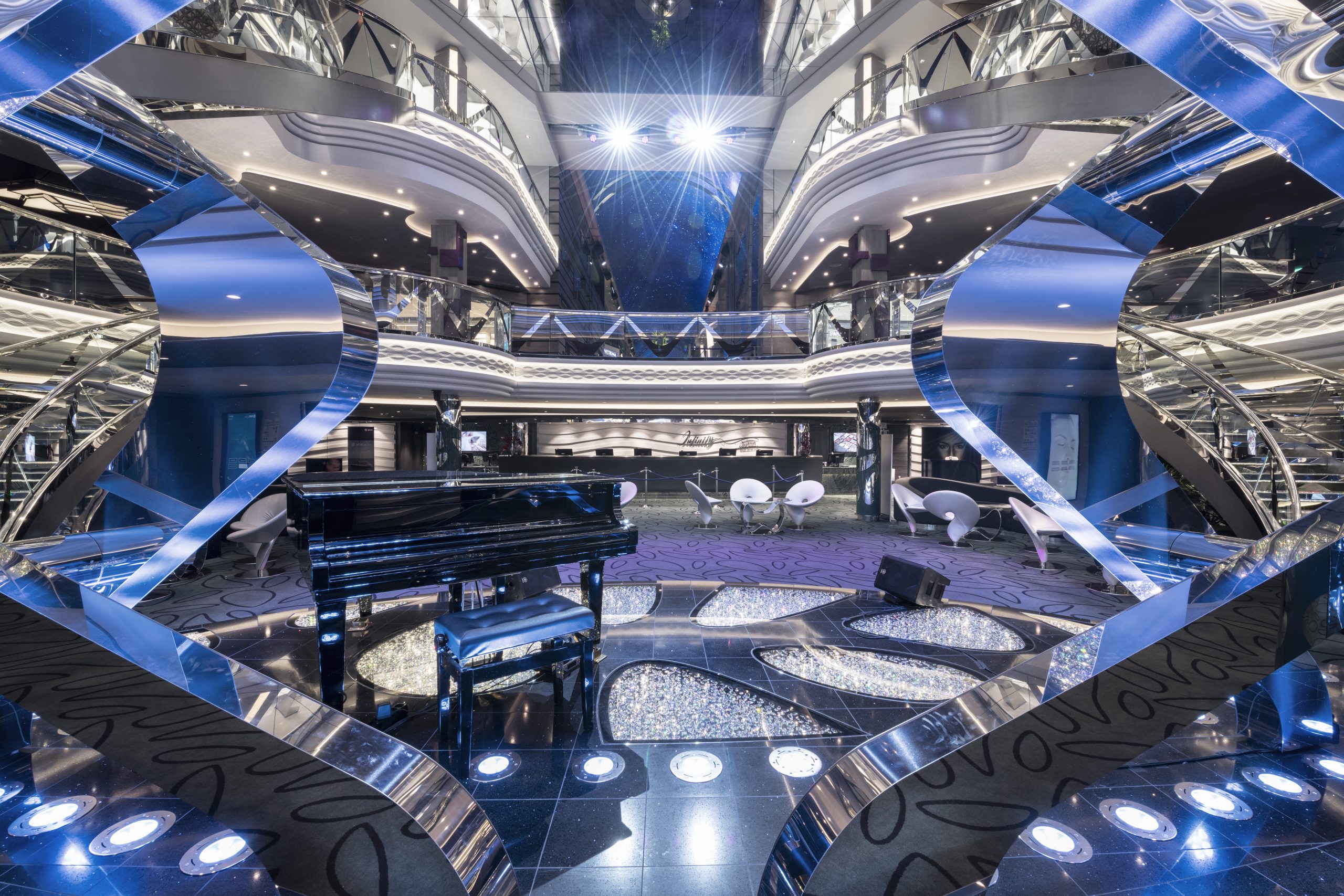 Immerse yourself in luxury as you enter the stunning three-level Infinity Atrium. With its magnificent Swarovski crystal staircase and sophisticated ambiance, this dazzling centerpiece will make every moment of your cruise feel truly extraordinary!