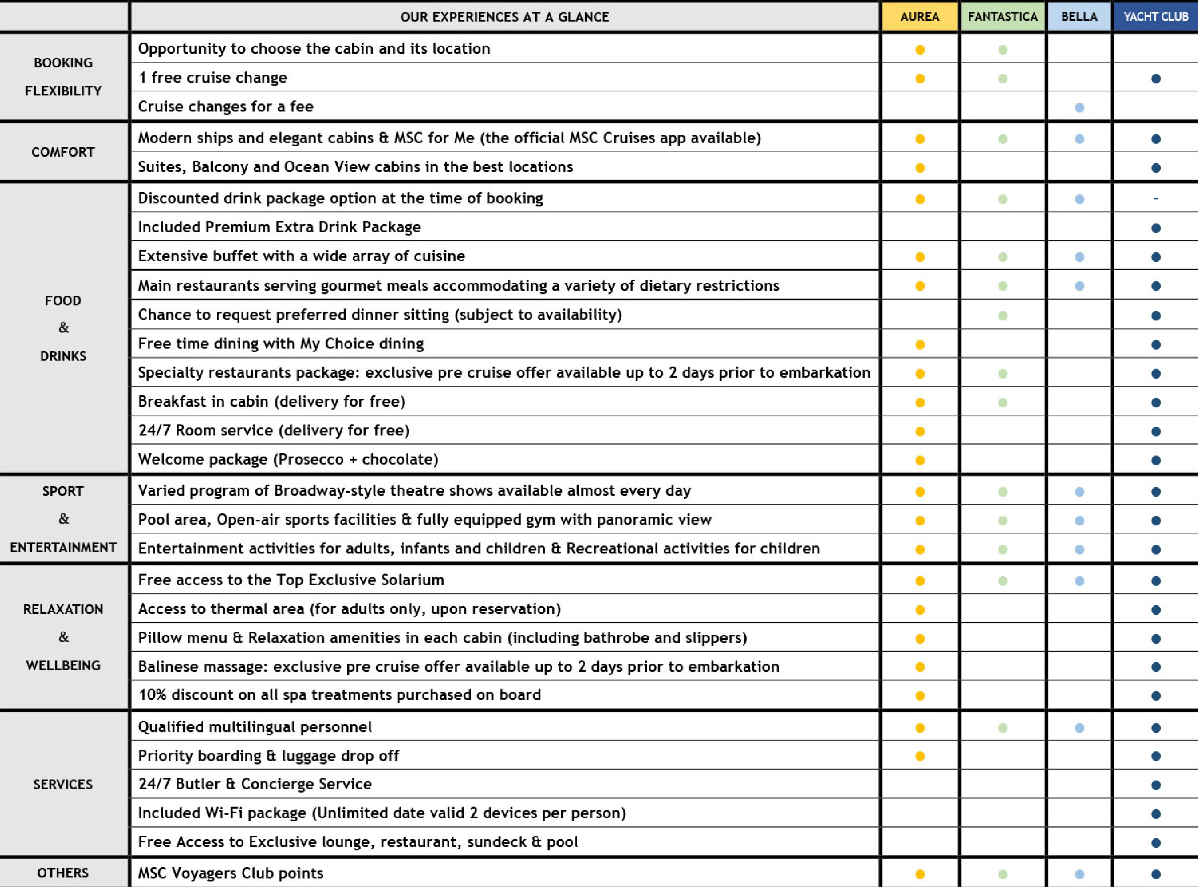 - You can enjoy an all-inclusive luxury cruise experience with a wide range of exclusive privileges, starting with 24-hour butler service, dedicated priority check-in and check-out, and a 24-hour dedicated concierge. Drinks are also included with the Premium Extra Drink package, not only in the MSC Yacht Club but also throughout the ship. This allows you to enjoy your favorite beverages at various locations such as the buffet, main restaurant, specialty restaurants, and onboard bars. Wi-Fi connection is available for the entire duration of the cruise with the Browse Cruise package for two devices per person. Gourmet dining awaits at the private MSC Yacht Club restaurant, with flexible dining times. The Top Sail Lounge offers nightly live music, while the Panoramic Top Sail Lounge provides a bar, afternoon tea service, and light food selection for 20 hours a day. All MSC Yacht Club suites are situated on the foredecks of the ship to ensure you exceptional comfort with room service available 24/7. You can benefit from unlimited access to the thermal area in the MSC Aurea SPA for your complete relaxation.
