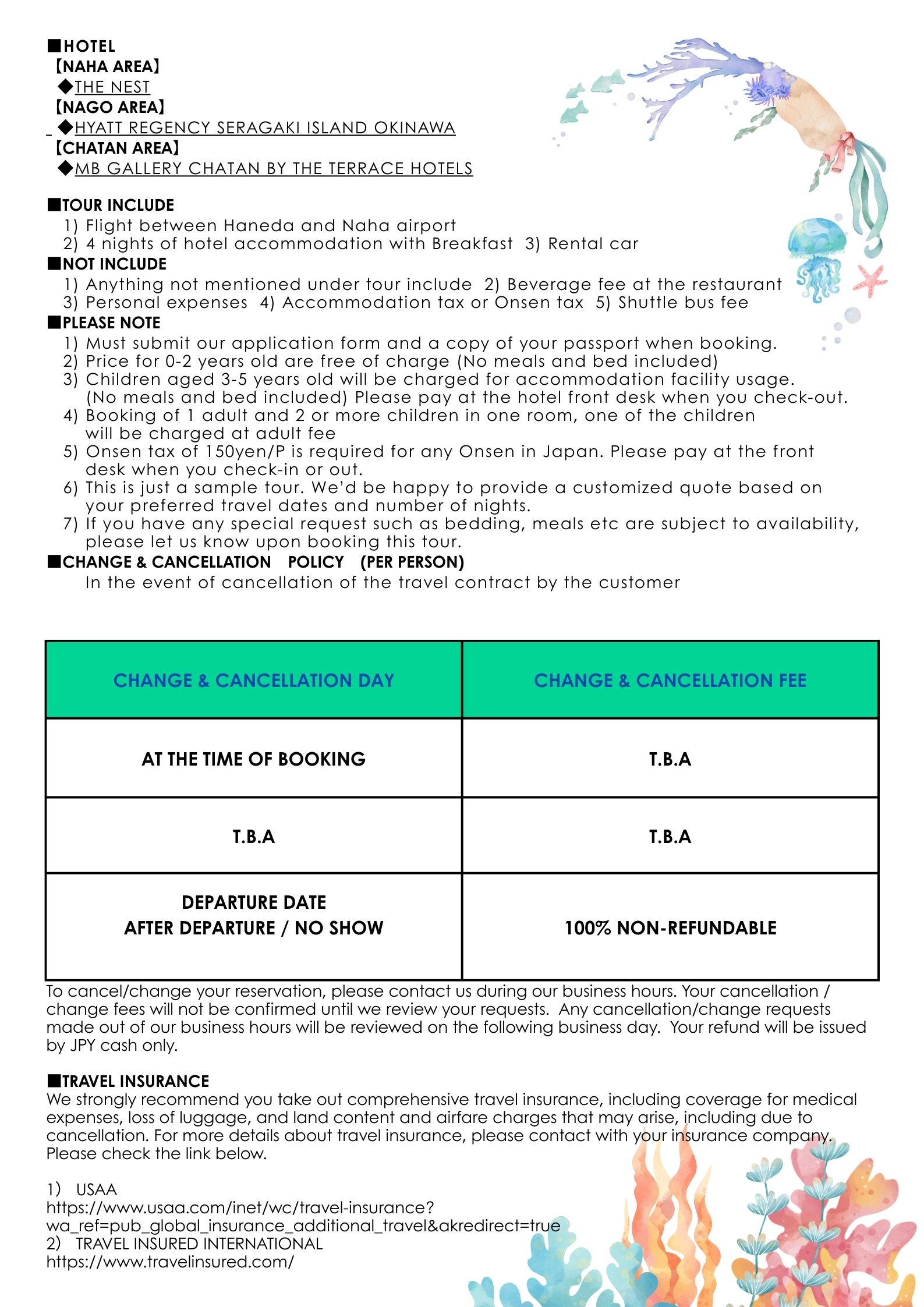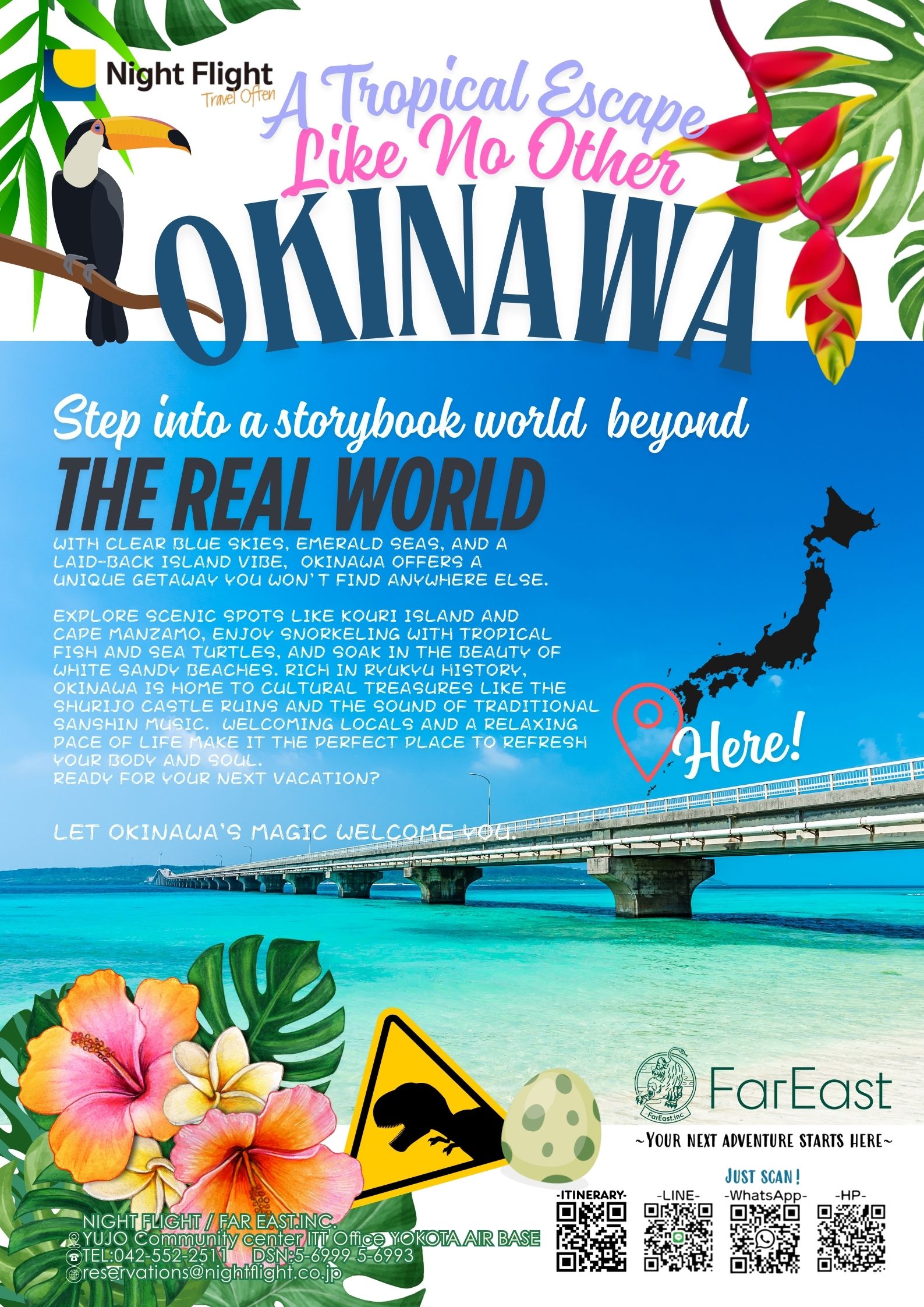 Okinawa -A Toropical Escape お問い合わせInquiry Form Last Name※ First Name※ Middle Name※ Please enter your name exactly as it appears on your passport. F M Emailメールアドレス※ Email(confirmation)メールアドレス(確認)※ Telephonenumber電話番号※ Type of Trip1旅行形態1 Japan Domestic International Type of Trip2旅行形態2 Tickets Air fare Package deal Others # of people人数 Adult Children Children age(AGE , , , , ) *If more than that, please enter in the Remarks field. Depart from出発地 Destination (s)目的地 Travel Date出発日 Return Date帰宅日 Budget希望予算 Yes No USD Per Person Preferred Airlines/Trains希望航空会社/列車/交通手段 Remarks(Max.500 Letters)備考欄 (最大500文字) ※ Privacy Policy The personal information you provide will only be used to respond to your inquiry. Please contact us if you wish to disclose, correct, or discontinue the use of your personal information. I agree to the terms of the Privacy Policy confirm